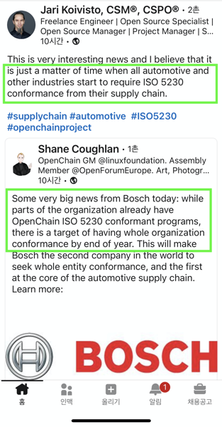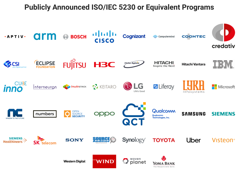 또한, 2021년 7월, 자동차 및 산업 기술 기업인 Bosch는 연말까지 모든 그룹사가 ISO/IEC 5230을 준수하는 프로그램을 갖추겠다고 선언하였습니다. 업계에서는 모든 자동차 제조사나 다른 산업에서도 소프트웨어 공급망 내에서 ISO/IEC 5230을 요구하기 시작하는 것은 시간 문제라는 전망을 내놓고 있습니다.