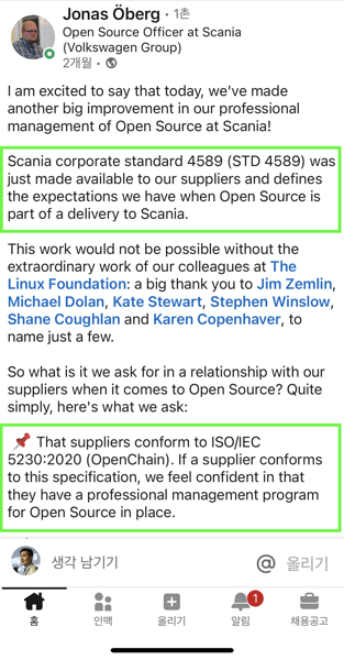 지난 4년간 사실상의 표준이었던 OpenChain 규격이 ISO/IEC 5230:2020이라는 정식 국제 표준으로 전환되었고, 이는 오픈소스 컴플라이언스 및 프로세스 관리를 정의한 최초의 국제 표준입니다. 이로써 글로벌 IT기업의 ISO/IEC 5230 준수에 관한 관심이 높아지고 있고, 소프트웨어 공급망에서 공급자들에게 ISO/IEC 5230 준수를 요구하는 기업이 늘어날 것으로 예상됩니다.