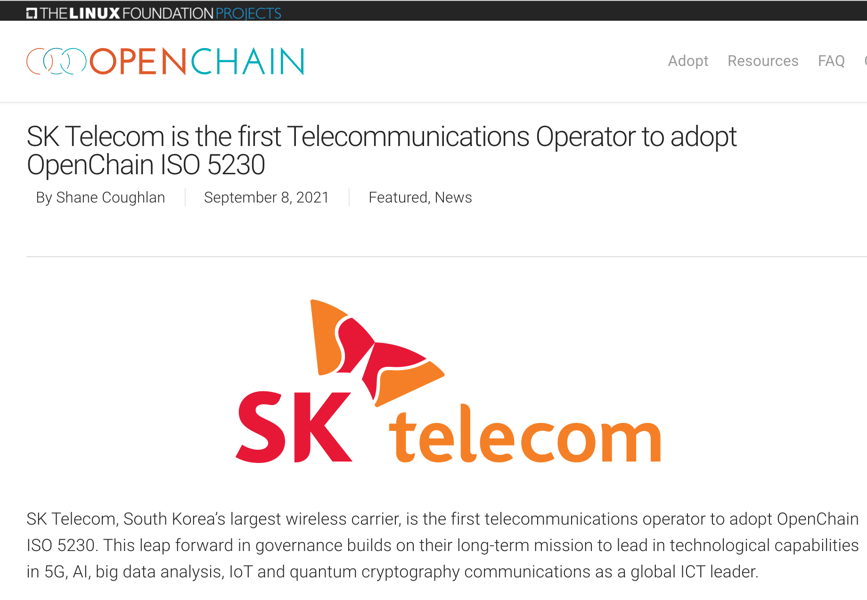 <예: SK텔레콤 인증 선언 - 출처: https://www.openchainproject.org/featured/2021/09/08/sk-telecom>