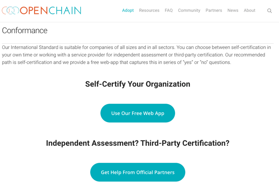 OpenChain 프로젝트는 자체 인증 방식을 권장한다. 참고로, OpenChain 적합성을 선언한 대부분의 기업도 자체 인증 방식을 채택하였다.