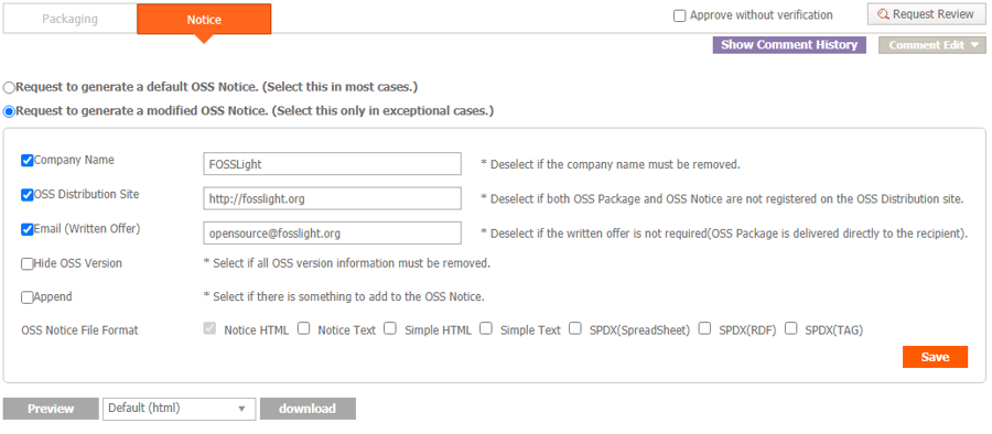 FOSSLight도 취득한 SBOM을 기반으로 오픈소스 고지문을 자동으로 생성하는 기능을 제공합니다.